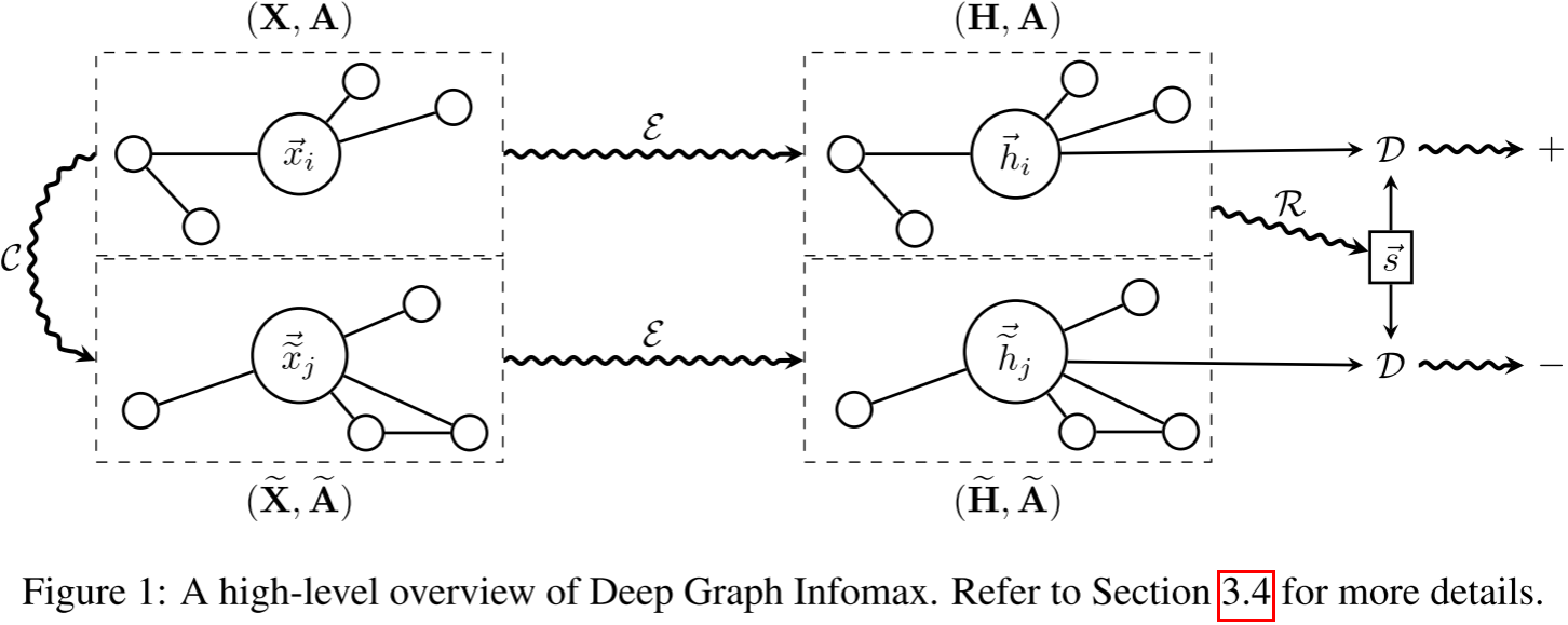 DGI的灵感来自Deep InfoMax (DIM),后者在图像上取得了成功。核心思想简洁而深刻: