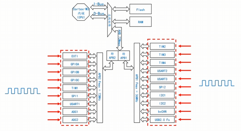 核心由 3 条总线串联所有外设,而所有外设都需要时钟信号驱动: