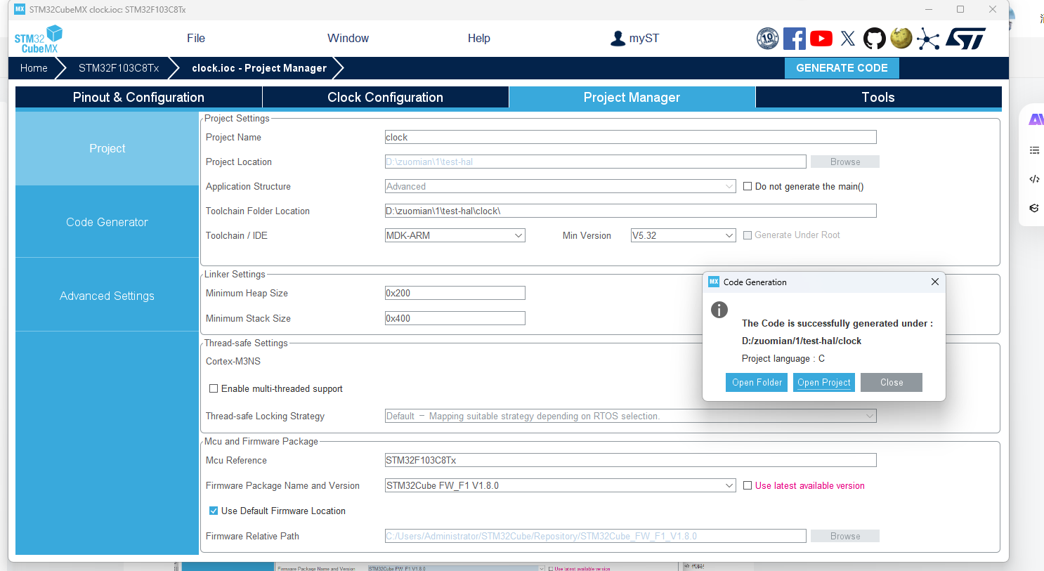 给项目取名、设置位置、选择开发的工具链,再点击GENERATE CODE生成
