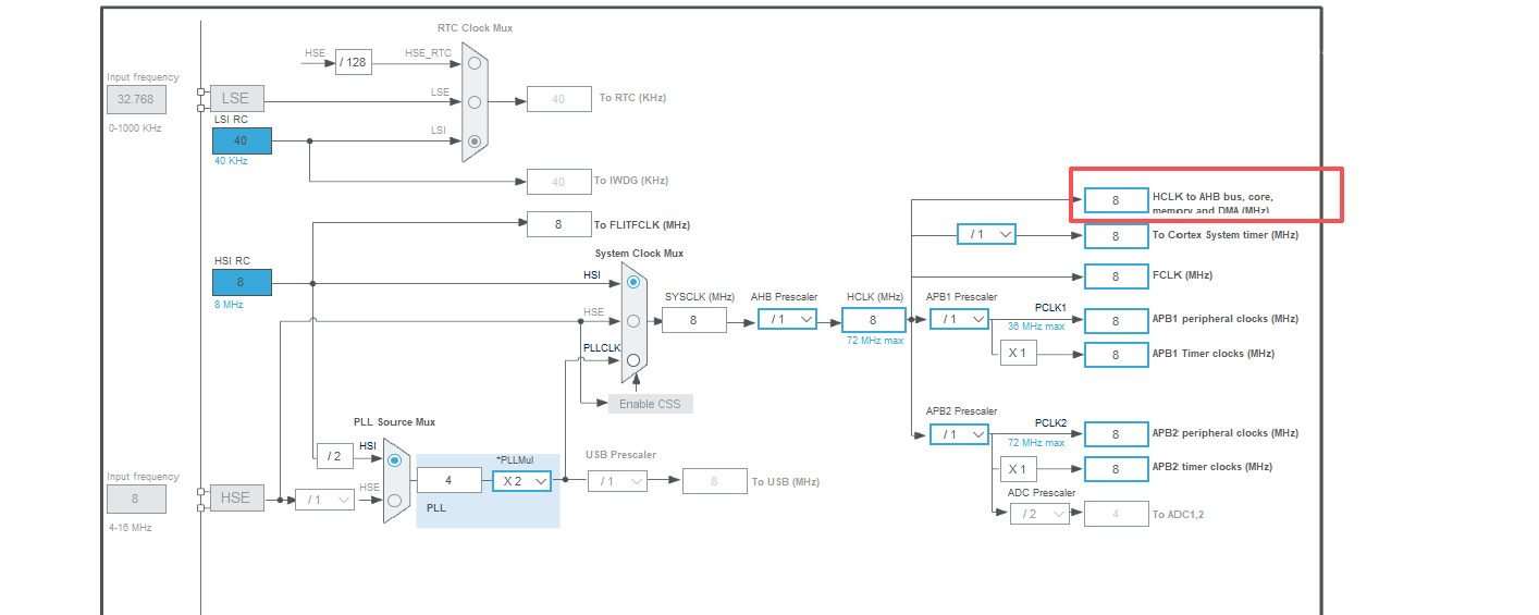 默认情况下SYSCLK为8MHZ,AHB的分频器默认情况是/1。所以此时HCLK频率(Cortex-M3频率)就为8MHZ。
