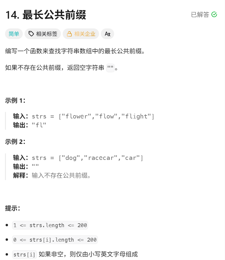 **方法二:**所有字符串同时比较,对于同一个下标,对所有字符串都遍历一遍看该字符串在这个下标的情况,当下标值等于该字符串的字数或字符不一样,即可返回最长公共前缀,若全部循环都通过,则返回其中一个字符串。