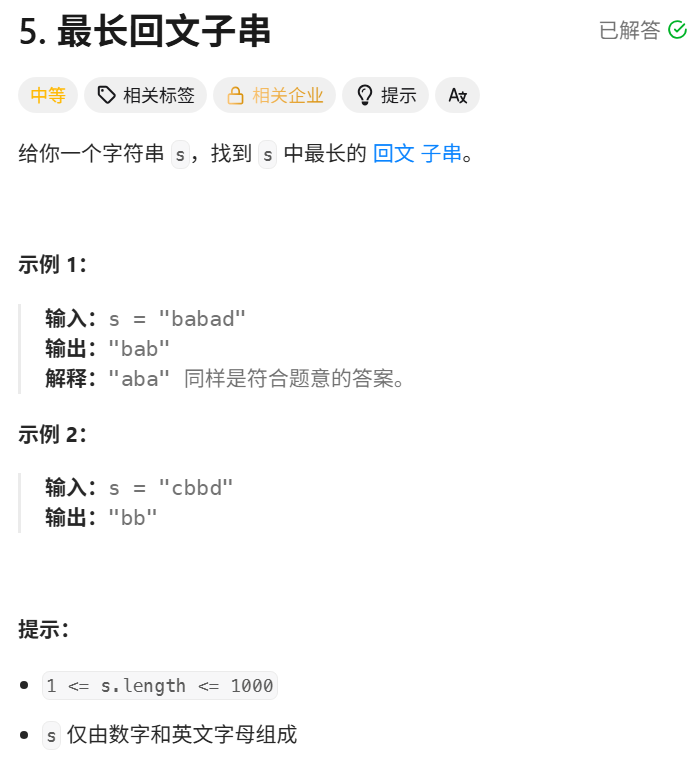 这道题的思路是遍历字符串,把遍历到的每一个字符认为是回文子串的中心,从该下标开始向两边走,确定最长的回文子串,并判断是否要更新数据(起始位置、长度),对于每一个中心字符,其有可能是中心字符中的其中一个(回文子串是偶数长度),也有可能是唯一一个(回文字串是奇数长度),所以对于每一个下标,要做两次判断,一次奇数一次偶数。