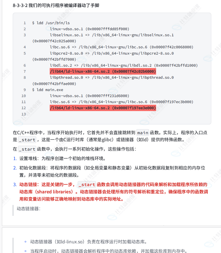 main函数,而是程序的底层入口_start函数。在这个启动阶段,程序会自动去调用系统提供的动态加载器(在 Linux 中通常是ld-linux.so)。由这个加载器接管控制权,去硬盘上找到你程序所需的动态库,并把它们加载映射到进程的虚拟地址空间里。完成这些准备工作后,才会真正开始执行你写的业务代码。"