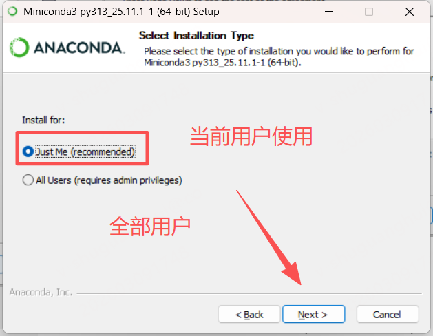 选择安装类型:建议选择"Just Me"(仅当前用户使用,无需管理员权限),点击"Next";