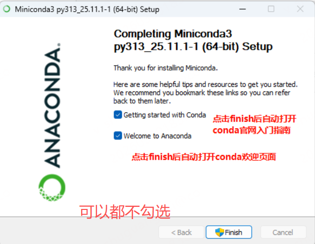 安装完成后,取消勾选"Launch Miniconda3",点击"Finish"。