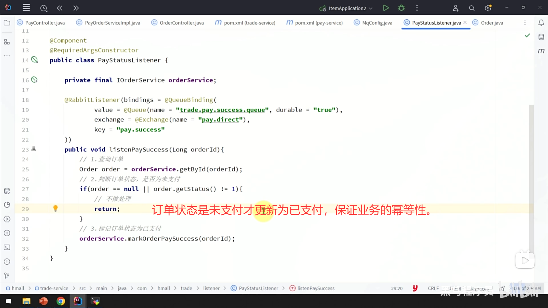 - 代码实现:涵盖生产者(Pay-Service)的消息发送逻辑与消费者(Trade-Service)的监听处理逻辑,确保业务逻辑的平滑迁移。