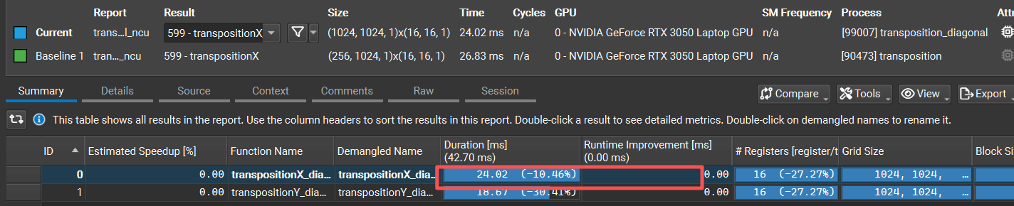 而按行转置可能会发生bank conflict,导致wrap中不同的线程访问同一块内存事务的地址,发生排队等待。其实后续的几种方法也是尽可能避免bank conflict,从而提高性能。