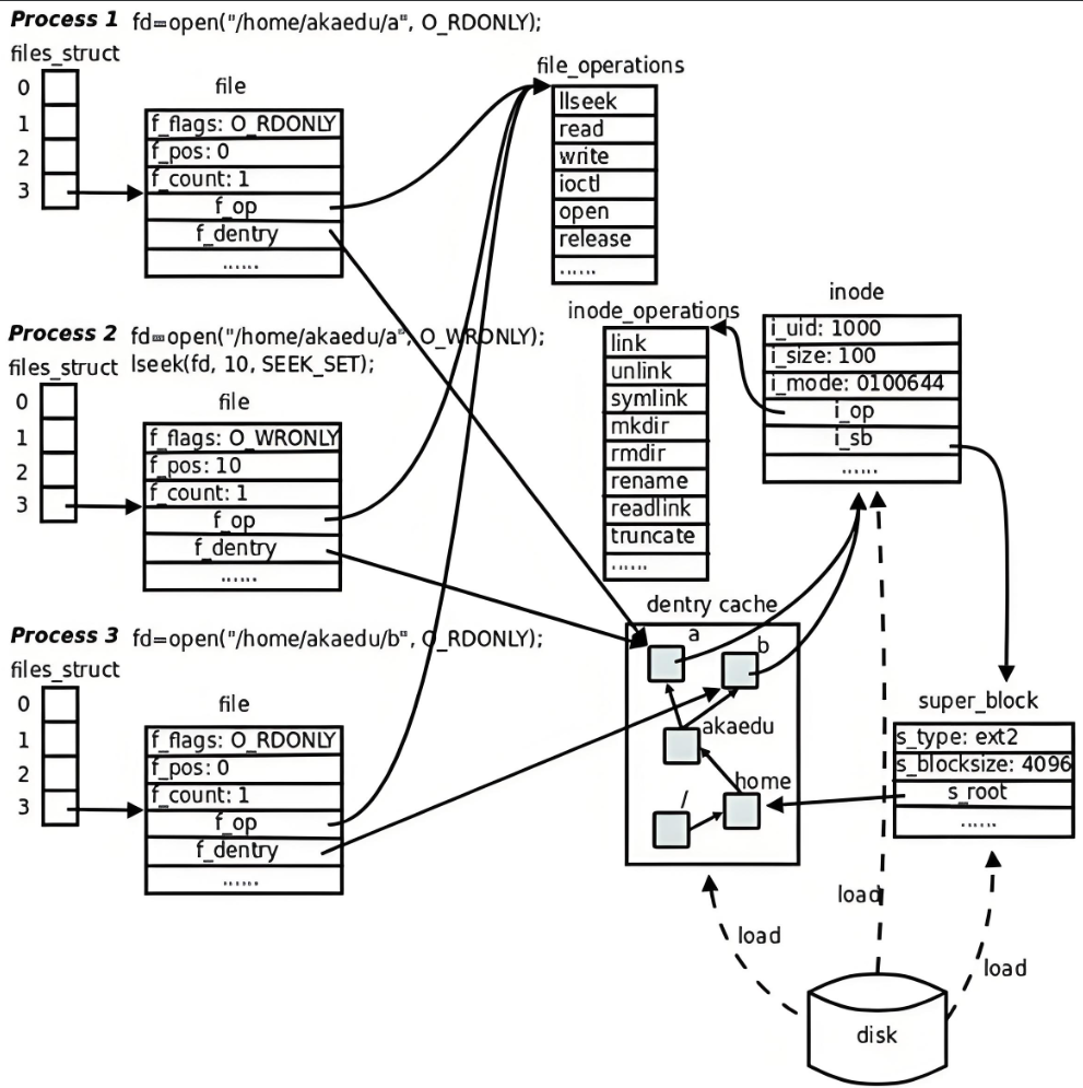 更重要的是,这个树形结构,整体构成了 Linux 的路径缓存结构,打开访问任何⽂件,都在先在这棵树下根据路径进行查找,找到就返回属性 inode 和内容,没找到就从磁盘加载路径,添加 dentry 结构,缓存新路径