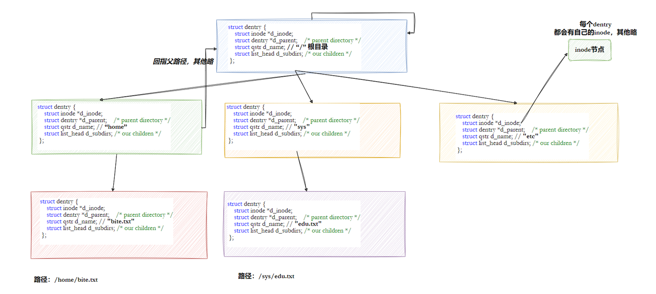 每个文件其实都要有对应的 dentry 结构,包括普通文件。这样所有被打开的文件,就可以在内存中形成整个树形结构