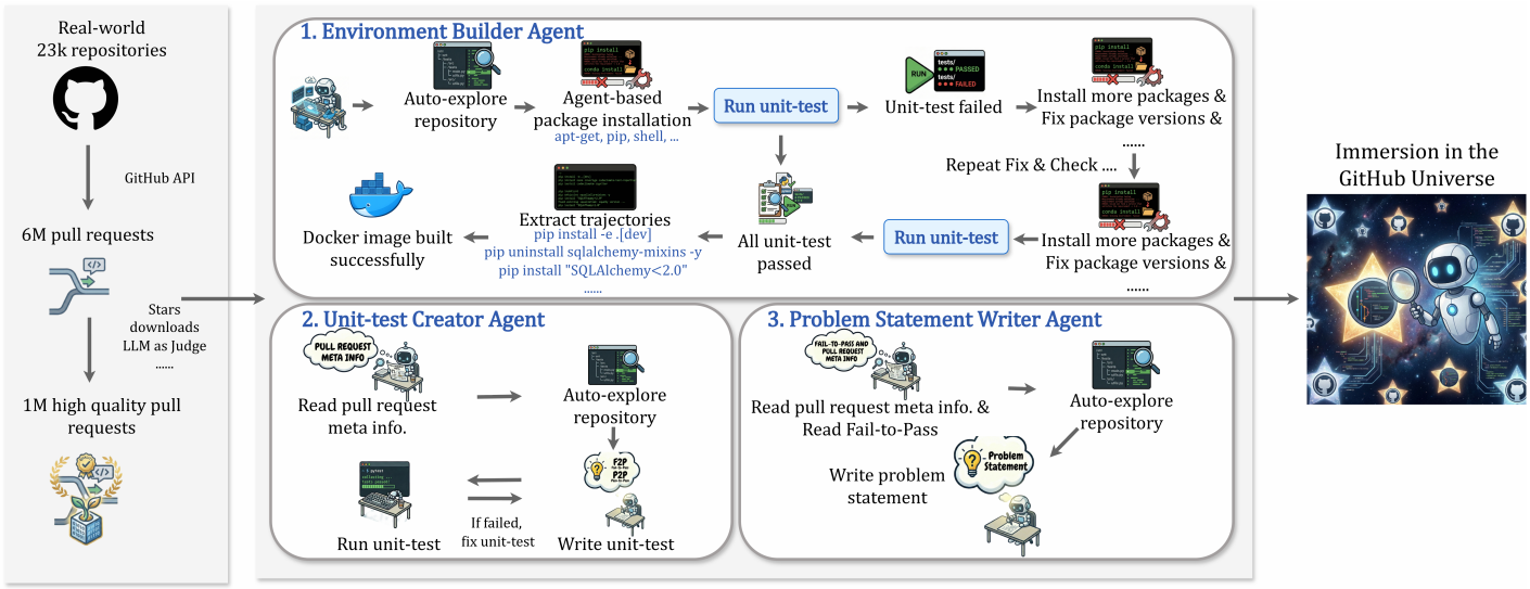 millions of raw GitHub pull requests, the pipeline employs a series of autonomous agents to