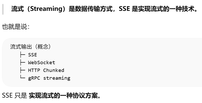 - [流式(Streaming)是数据传输方式,SSE 是实现流式的一种技术](#流式(Streaming)是数据传输方式,SSE 是实现流式的一种技术)