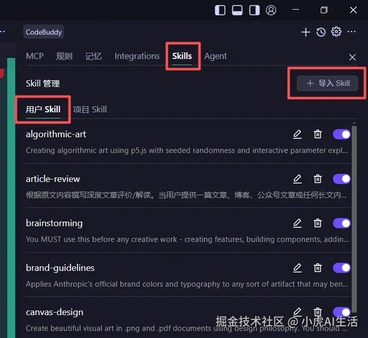Project Skills或User Skills点击导入 Skill。