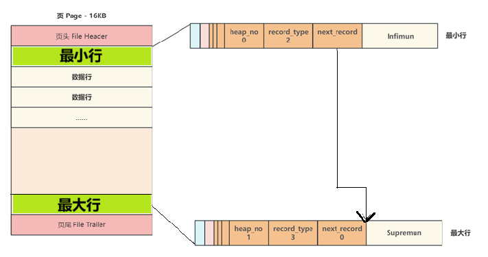 事实上,最小行和最大行在未插入数据行时,是挨在一起的,当有数据插入时,都会插入在它们的中间,即页一初始化,就先把这两条写死,让它们挨在一起,形成一个空链表框架,当有数据行时,就往中间插入。