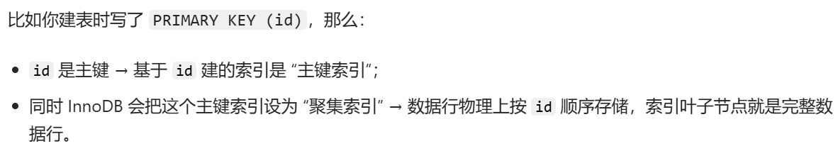 在日常情况下,主键索引几乎就是聚集索引,只有一种情况能看出 主键索引≠聚集索引 区别:表没有显式主键时,InnoDB 会选其他字段做聚集索引,但这个字段不是主键。