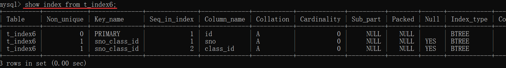 以上的查询语句都是需要回表查询的(主键索引除外),除了在子查询的时候使用了索引覆盖。再举一个索引覆盖的例子:用复合索引 sno_class_id 举例: