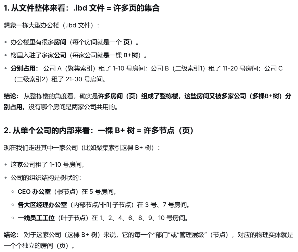 前面说过一张表对应一个 .ibd文件,而一个 .idb文件中包含许多页 ,也就是说,一个 .ibd文件包含许多B+树。即一个 .ibd 文件 = 一大堆 16KB 页 = 一大堆 B+ 树节点