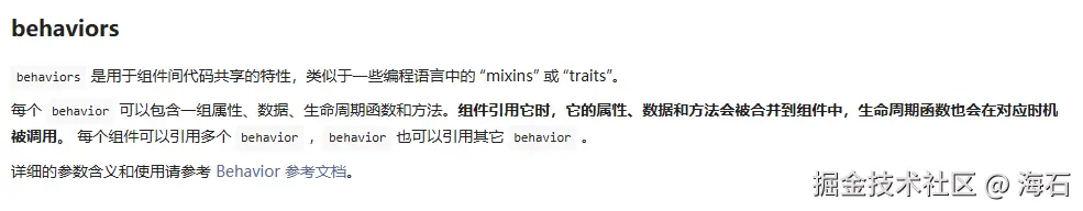 查阅文档后我们明白behaviors有点类似 Vue 中的mixins,