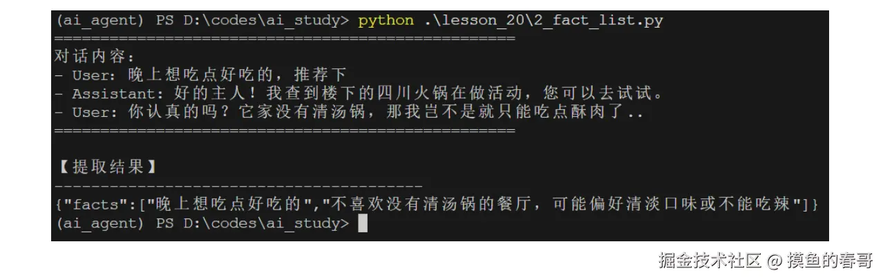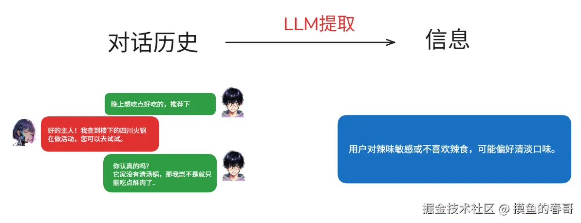 因此,在用户和Agent产生实际对话时,我们需要把 Agent 和 用户 的对话历史放在一起,配合合理的系统提示词,才能提取到足够有效的信息,