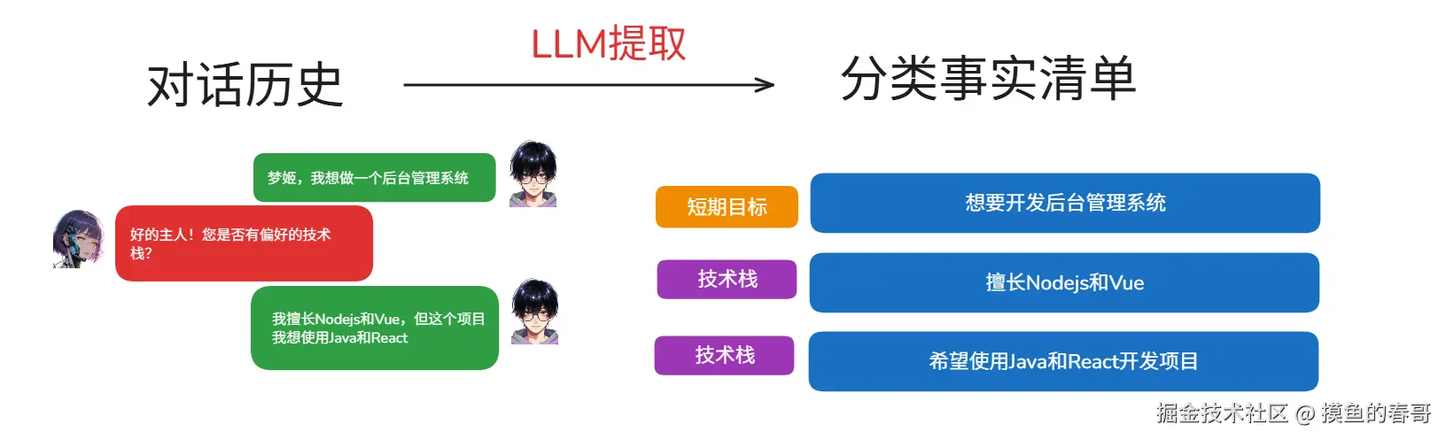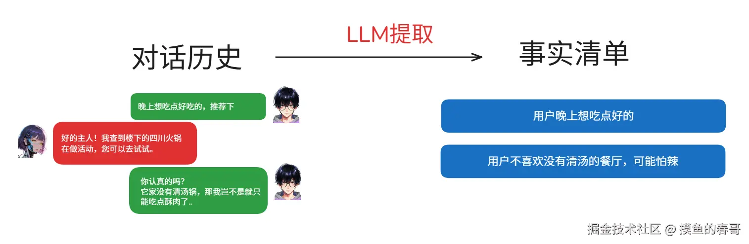 | 处理对象 | 时间线上的原始对话记录 | 向量库里语义相似的独立事实片段 |