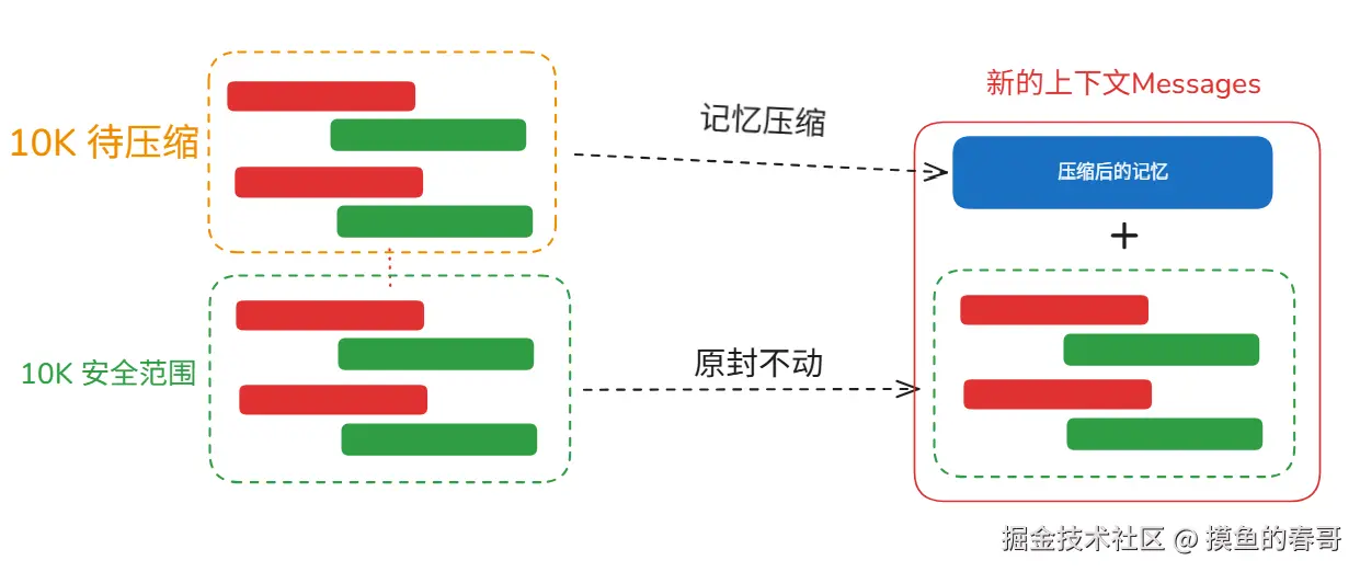 每当上下文的Token数达到 20K 是,就对 10K - 20K 范围内的这10K Token进行压缩,生成【压缩后的记忆】