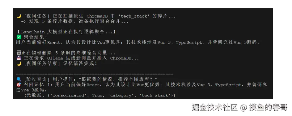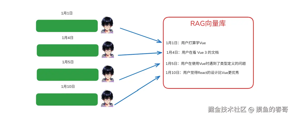 比如说,以上例子里,假若Agent的策略是只取RAG查询到的前3条,那就会漏掉 "1月10日:用户觉得React的设计比Vue更优秀" 可条可能严重影响技术栈选择的消息。