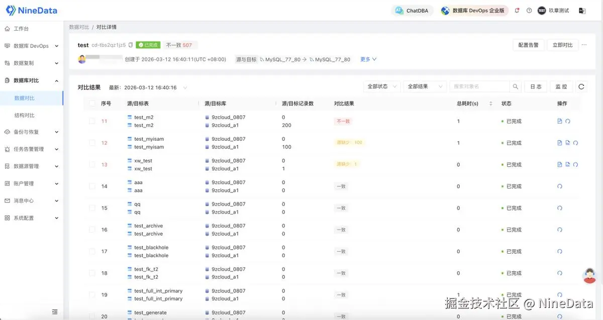 NineData通过将数据迁移与一致性校验深度整合,提供了一套自动化解决方案。对于正在进行云迁移、异构数据库迁移或数据仓库建设的企业来说,这类自动化方案可以显著降低数据运维成本,并提升数据一致性的可靠保障。