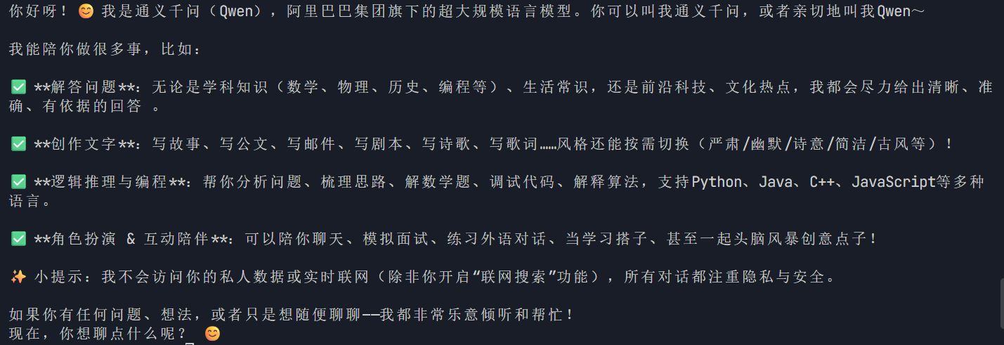 以下是完整的调用代码。我们选择 qwen-max 模型,因为它是一个强大的通用大语言模型。