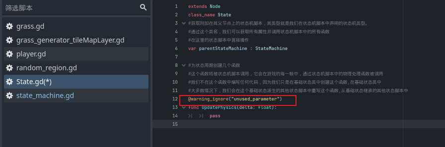 - 然后我们来到State.gd脚本文件夹进行创建一个类,然后获取附加在其父节点上的状态机脚本,然后创建几个函数可以给其他脚本进行继承复用