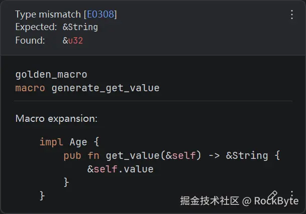 当我们把同一个宏用到 Age 和 Pay 这两个结构体上时,编译器会报错:mismatched types: expected reference &String found reference &i32。