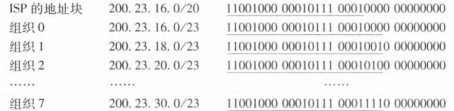 我们已经详细地学习了 IP编址, 还需要知道主机或子网最初是如何得到它们的地址的。我们先看一个组织是如何得到一个地址块的、 然后再看一个设备(如一台主机)是如何从某组织的地址块中分配到一个地址的。为了获取一块IP地址用于一个组织的子网内, 某网络管理员也许首先会与他的ISP联系,该ISP 可能会从它的更大地址块中提供一些地址。例如, 该ISP也许自己已被分配了地址块200.23. 16.0/20。 该 ISP 可以将该地址块分成8 个长度相等的连续地址块,为ISP 支持的组织分配这些地址块中的一块.如下所示。