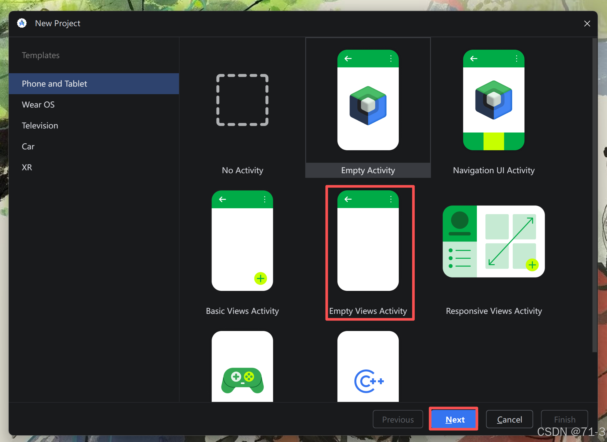 - 更改项目的存放位置,选择语言(有两个,一个是Java、一个是kotlin)