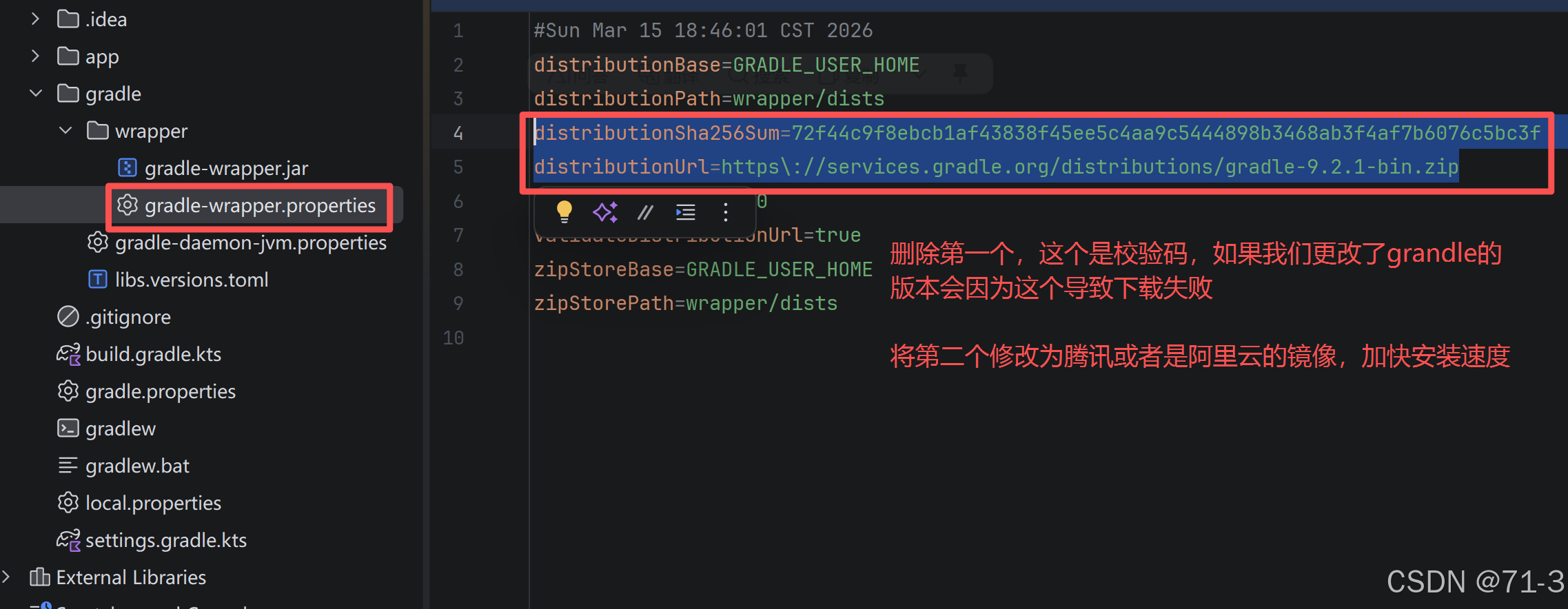 - distributionSha256Sum 的作用:校验下载的 Gradle 是否完整和安全。(属于安全机制)