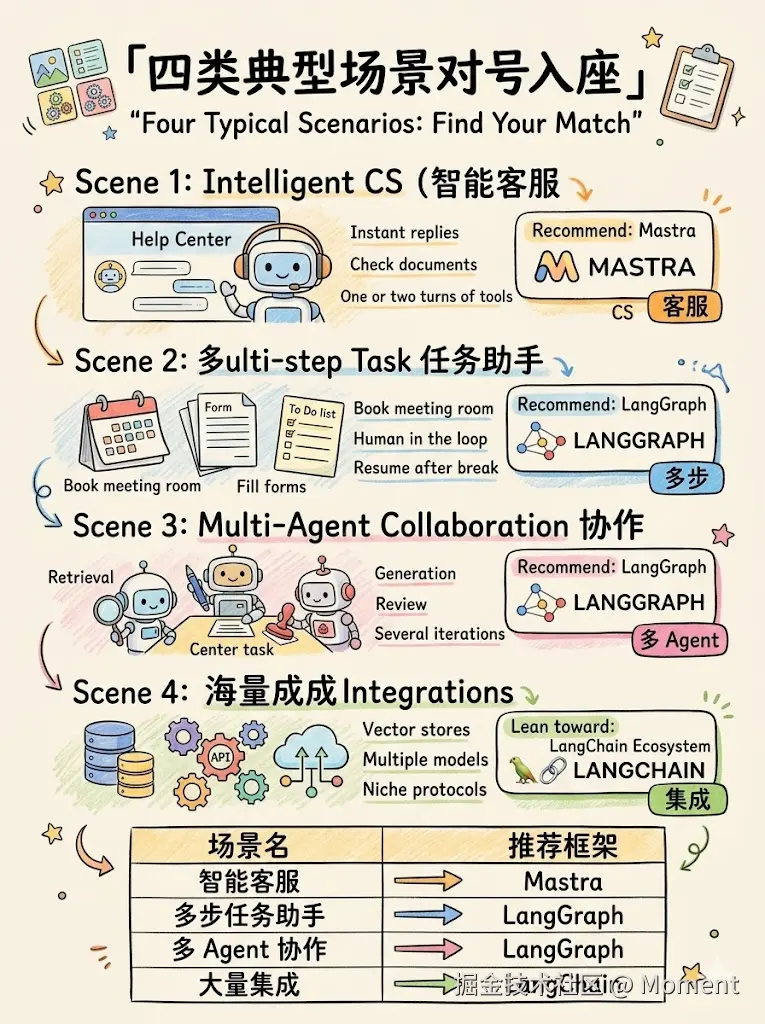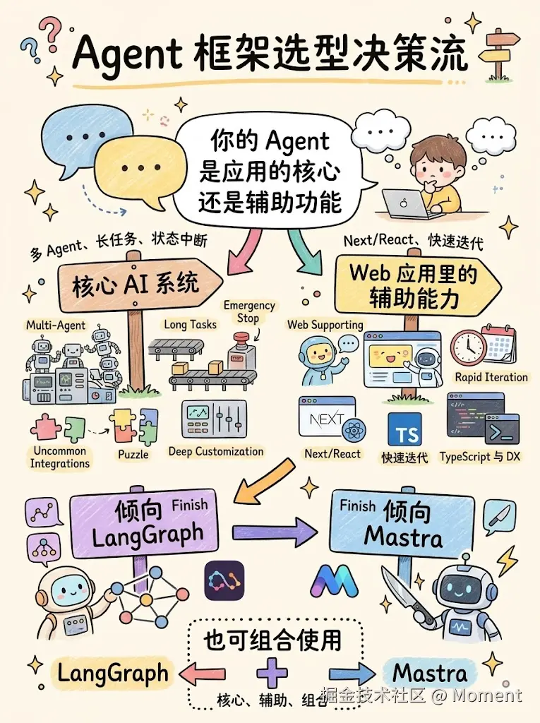 可以按"产品形态、团队基因、集成与定制需求"三条线问自己,再对照上文对比。决策主线就一条:先看 Agent 是"应用的核心"还是"应用里的辅助能力"。核心场景(多 Agent、长任务、状态中断与恢复、大量冷门集成或深度定制)更倾向 LangGraph;辅助能力(Next/React 为主、快速迭代、极重 TypeScript 与 DX)更倾向 Mastra。不必二选一,也可以简单对话用 Mastra、复杂管线用 LangGraph,按模块边界拆。