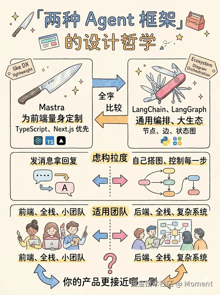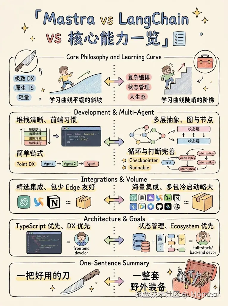 两者没有绝对优劣,差别主要在"设计哲学"和"业务场景"的匹配度。Mastra 像为前端量身定制的厨师刀,刀刃顺手、切菜切肉都轻松;LangChain.js(尤其是 LangGraph.js)则像重型瑞士军刀,刀锯镊子开瓶器齐全,能应付各种复杂场景,代价是重量和复杂度都更高。下文从 2026 年技术生态出发做一次对比,并配上代码与图示,方便你理清思路、少走弯路。