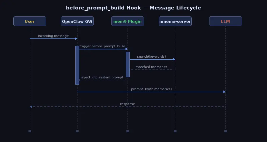 mem9 的思路完全不同:它是一个独立的 memory server(mnemo-server),通过 REST API 管理记忆,并注册了 OpenClaw 的 before_prompt_build hook。每次对话开始前,它自动提取上下文、搜索相关记忆、注入 system prompt------整个过程对 agent 透明。