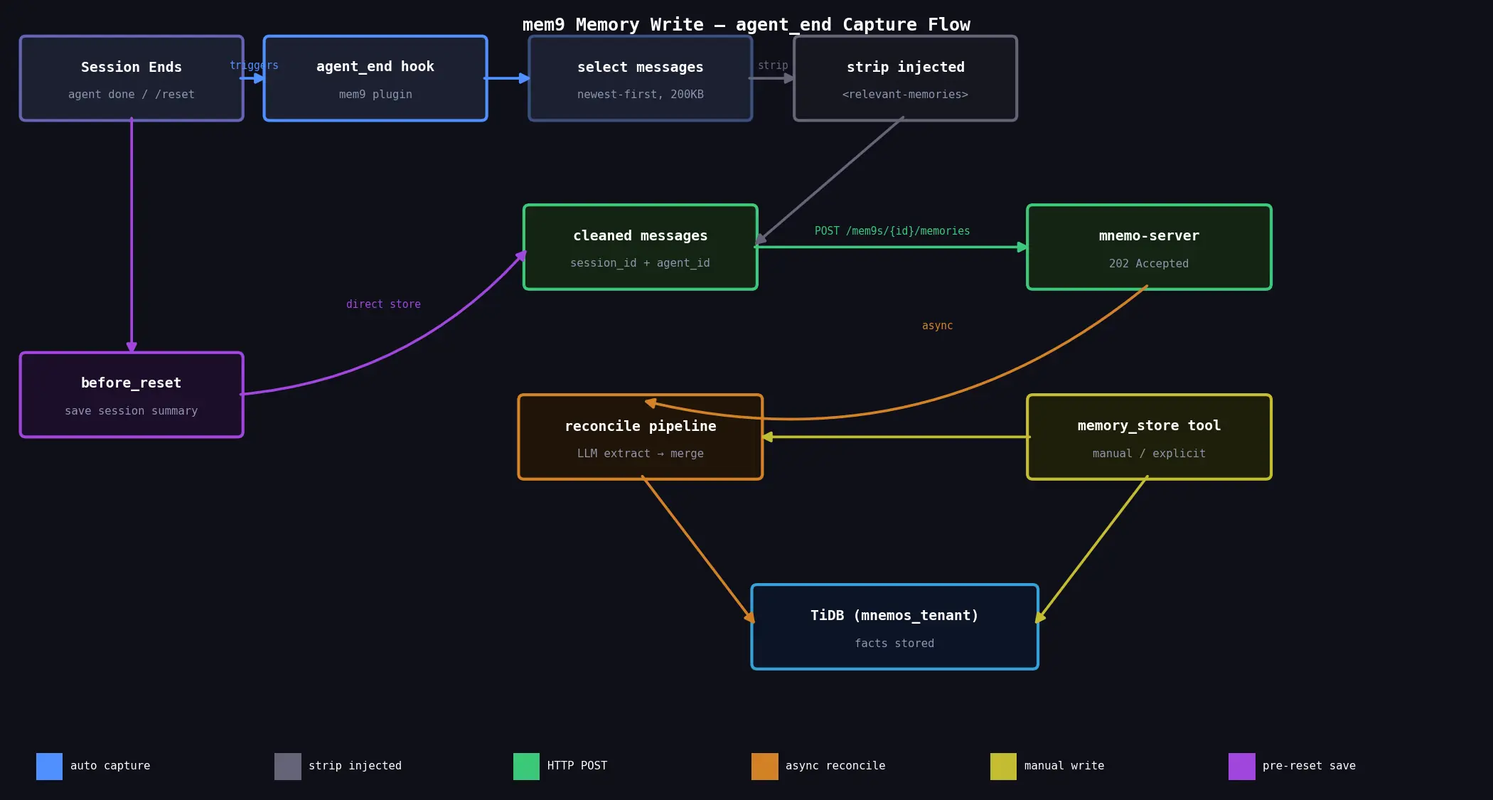 每次会话结束时,OpenClaw 触发 agent_end,mem9 插件自动执行: