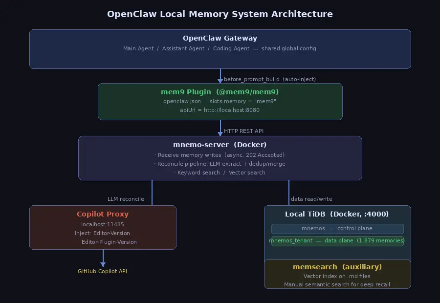 搭建这套系统的过程比预期复杂------Copilot Proxy、控制平面迁移、历史数据批量导入,每一步都有坑。但跑通之后,1,879 条记忆完整落地本地,mem9 自动注入开始工作,那种感觉是不同的:这是真正属于自己的记忆系统,不依赖任何外部服务的持续运营。