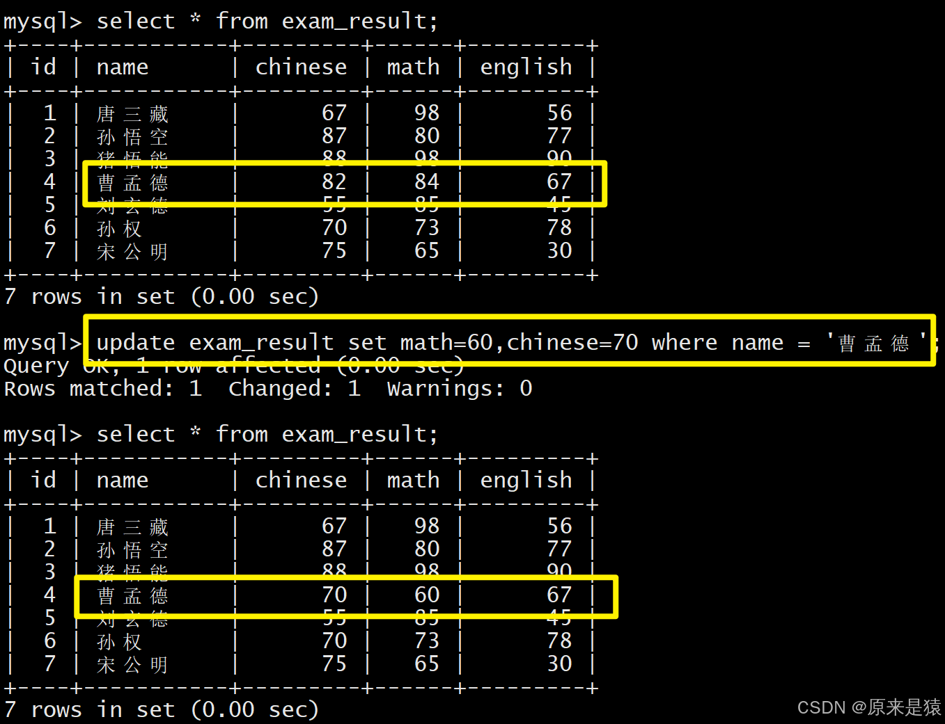 1.2 将曹孟德同学的数学成绩变更为60分,语文成绩变更为70分