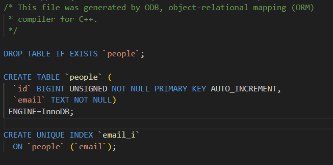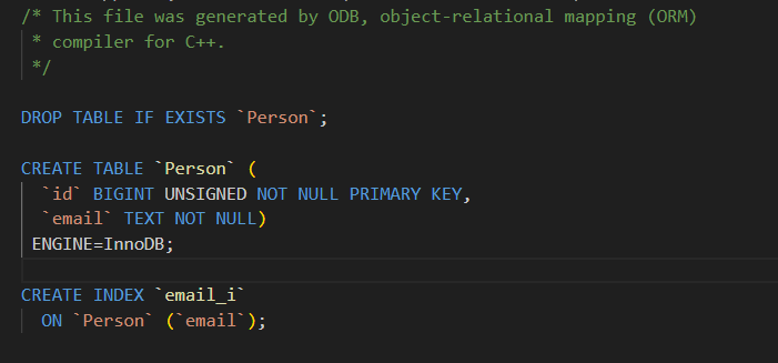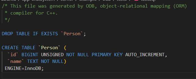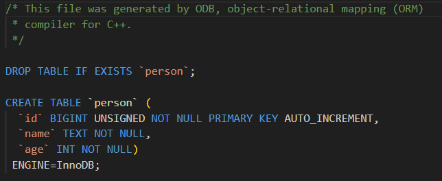 写完类定义后,你运行一个叫 odb 的命令行工具,告诉它"请根据这个类生成与 MySQL 交互所需的代码"。这个工具会分析你的类,并生成一组新的 C++ 文件(比如 person-odb.hxx 和 person-odb.cxx)。这些文件里包含了所有让 ODB 知道如何把 Person 对象存到 MySQL 的代码,比如如何构造 SQL 语句、如何把对象的数据填到 SQL 里、如何把查询结果转回对象等。