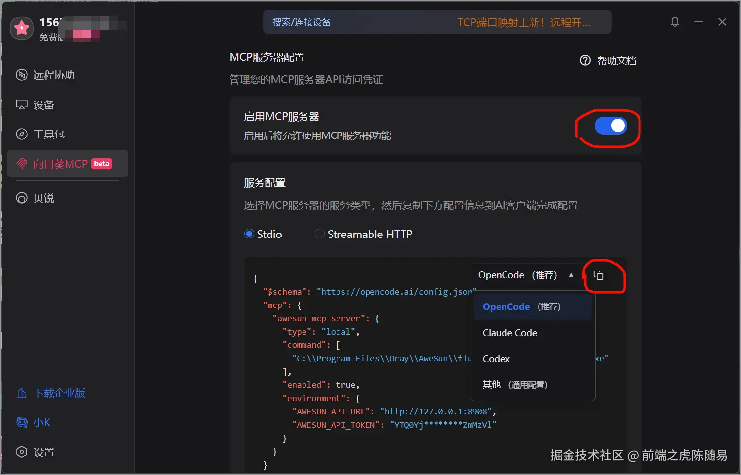 安装完毕后,点击向日葵MCP,把开光打开,可供AI操控的MCP服务就开启了。