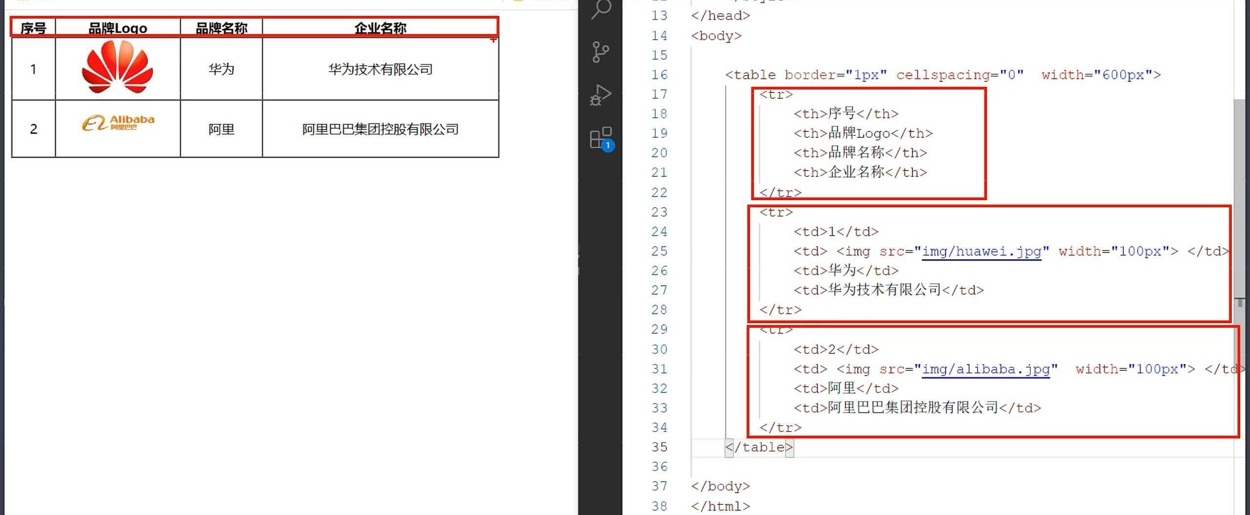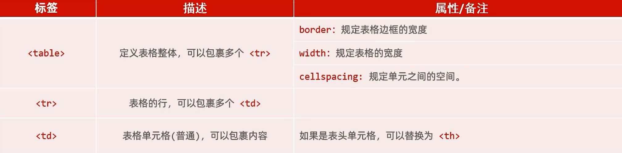 场景:在网页中以表格(行,列)形式整齐展示数据,如:班级表