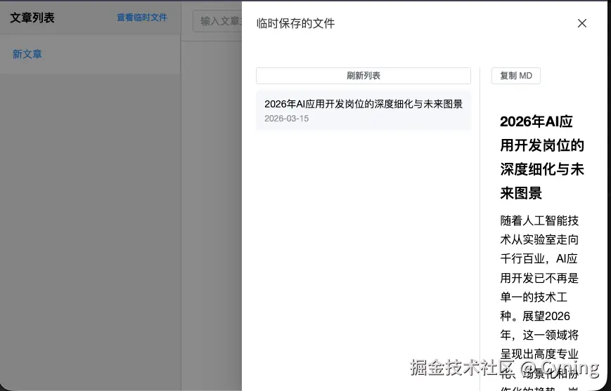 GET /api/articles/temp,展示已落盘的临时文章(标题 + 日期)。 - 点击某一项请求