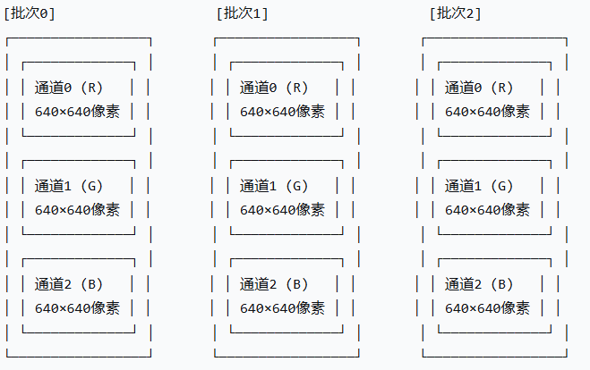 2)单张图数据内,按通道优先的方式存储,先存储R通道的所有640×640像素数据(从左向右,从上向下),再存储G通道所有像素数据、B通道所有像素数据。