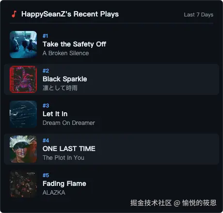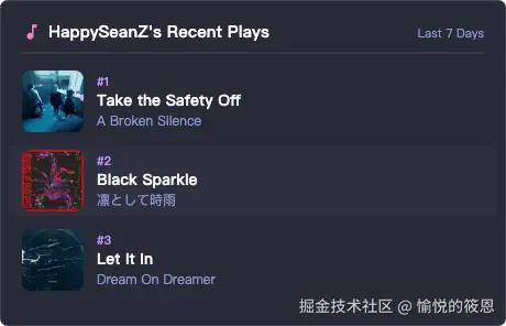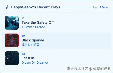 最近抽空捣腾 GitHub 个人主页,发现不少人挂着 Spotify 的听歌排行组件,类似 spotify-recently-played-readme 这种。效果挺好看的,一张卡片展示最近在听什么歌,给主页多了点个人气息。