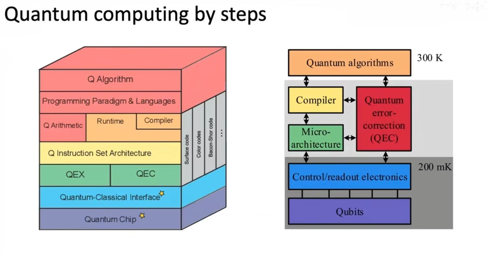 左侧的立方体结构可以理解为一个从硬件到应用逐层向上的结构。最底层是量子计算机的物理硬件,其上依次是量子逻辑运算、指令集架构、编程语言和编程方式,最上层则是量子算法。简单来说,就是把复杂的量子算法一步步拆解:先提出算法解决问题,再写成程序,然后转化为计算机能够执行的指令,最终由硬件完成具体的量子操作。图中提到的 Surface code、Color code 等则是常见的量子纠错方法,因为量子比特很容易受到环境影响而产生错误,所以需要通过纠错技术来保证计算结果的可靠性。