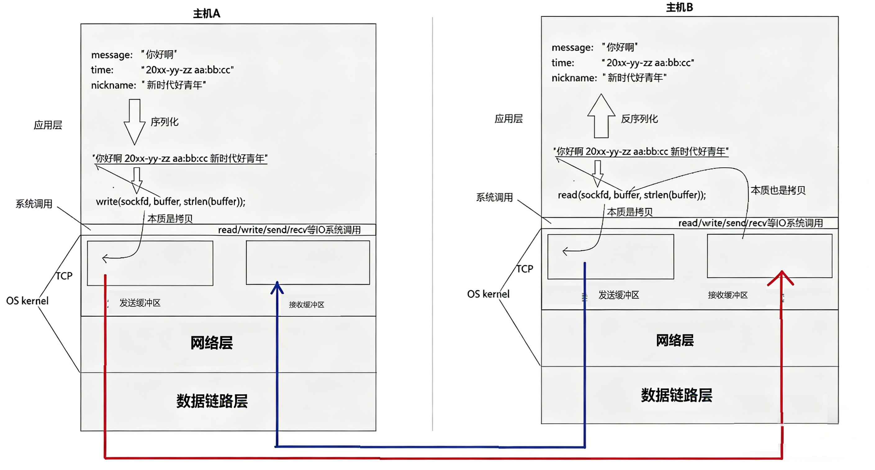 在使用TCP协议时,我们调用的send和recv本质就是拷贝操作,使用send时就是将要发送的内容拷贝到缓冲区中,相应的,调用recv则是从缓冲区中拷贝到程序地址空间。