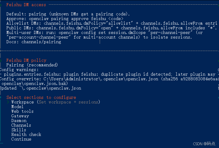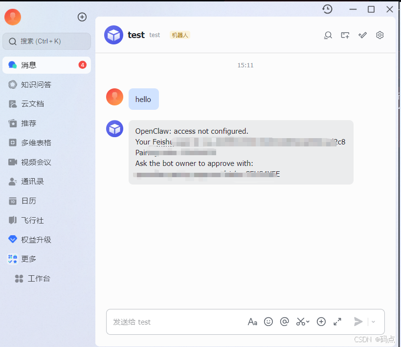 然后在飞书里找到你刚创建的机器人,发送一条消息,它会自动回复一个配对码