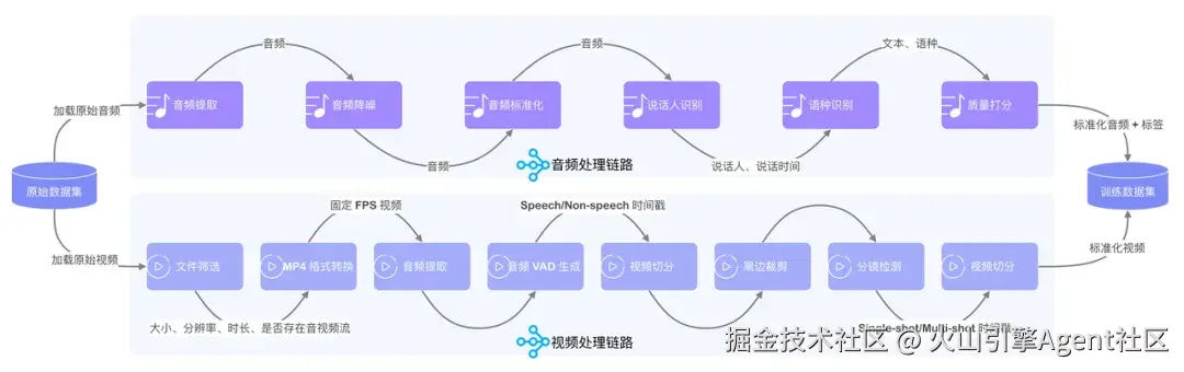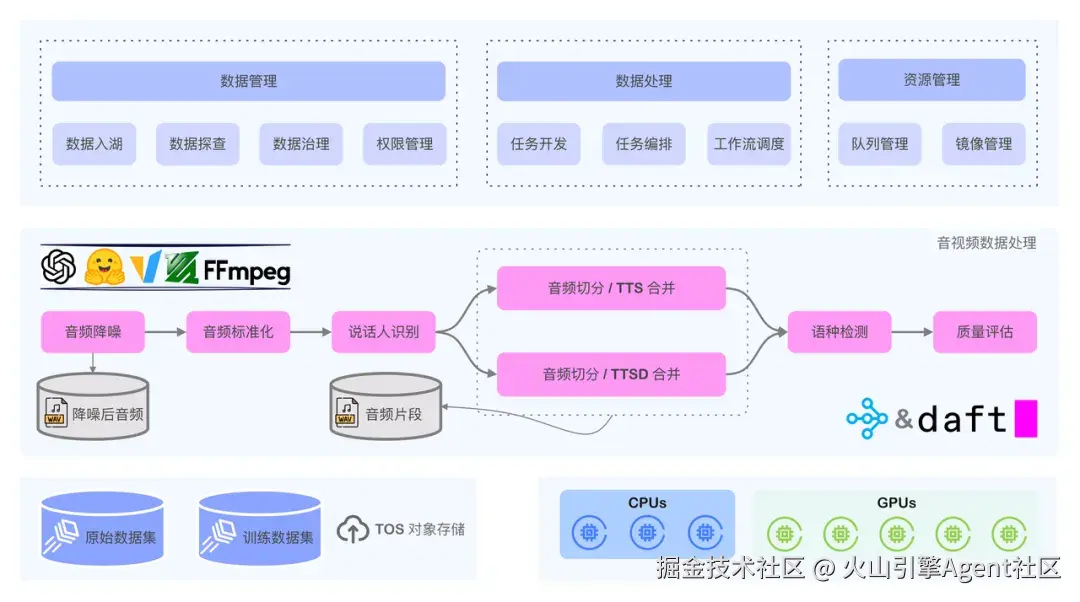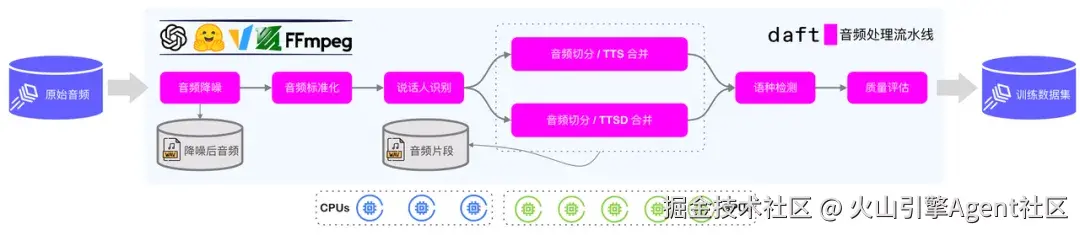 模思公司基于火山 LAS 产品构建了一套完整的语音合成训练数据处理流水线,涵盖音频降噪、格式标准化、说话人分离、语种识别、语音转文字等关键环节,集成了 MossFormer2、Whisper、DiariZen 等多种先进模型,这些环节的串联和执行均由 Daft 计算引擎驱动。