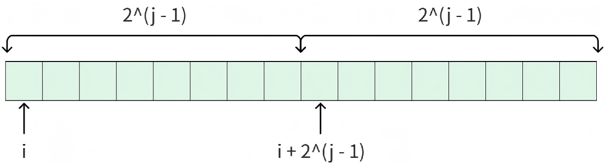 因为 2 j − 1 + 2 j − 1 = 2 j 2^{j-1} + 2^{j-1} = 2^j 2j−1+2j−1=2j ,所以长度为 2 j 2^j 2j 的区间,可以分成 2 个长度为 2 j − 1 2^{j-1} 2j−1 的区间。