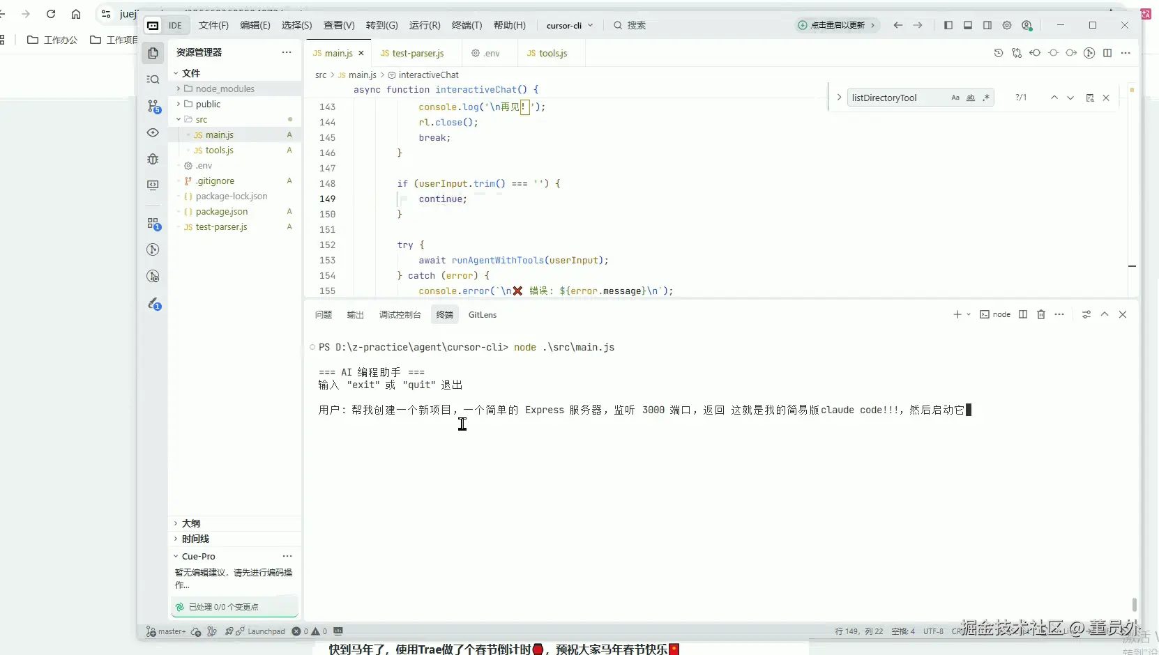 在此之前我们已系统掌握 LangChain.js 的核心基础:从豆包大模型的接入、invoke/stream 的调用,到 Messages 消息体系的运用,再到自定义 Tool 的开发与工具调用闭环的实现,为打造专属代码助手筑牢了技术根基。